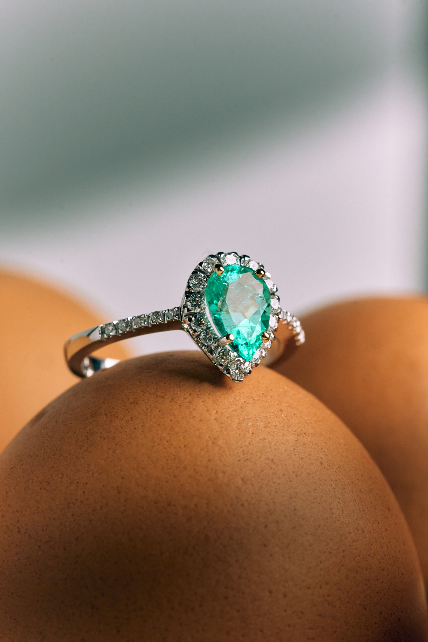 Il cuore del gioiello è uno smeraldo naturale dal ricercato taglio a goccia caratterizzato da una tonalità verde acqua cristallina e luminosa.