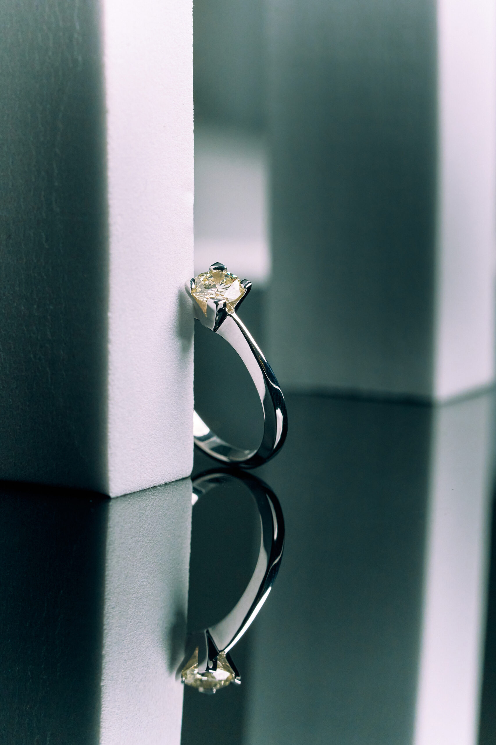 Il design si distingue per un gambo liscio e lucido a specchio che si assottiglia leggermente verso l’alto, guidando lo sguardo verso un diamante naturale taglio brillante. La pietra è custodita da una montatura a quattro griffe, studiata appositamente per permettere alla luce di attraversare il diamante da ogni angolazione, massimizzandone il fuoco e la brillantezza.